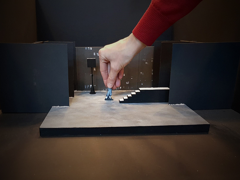 Ja. Och där någonstans kom min första ahaupplevelse: hon ska ju röra sig! Flickan måste kunna gå på scenen. Det kändes jätteviktigt att få till det motståndet, den rörelsen. Hur skapar man den? Rummet är ju fast och stilla, hur ska hon kunna gå? Det var då jag kom på att jag ville använda ett rullband. Med det går det också att leka med både rörelse och stillastående, och att jobba mot rullbandet. Saker och människor kan åka in och ut och skapa illusioner.