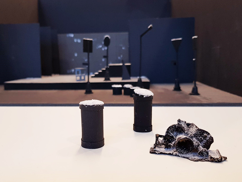 Vi förstod snabbt att scenen måste vara väldigt visuell, eftersom det inte finns någon text. Föreställningen bärs av det visuella, musiken och kroppar som rör sig. Dessutom bygger sagan på att flickan börjar drömma när hon tänder stickorna. Så en av de första sakerna vi frågade oss vad som skulle vara skillnaden mellan fantasi och verklighet, hur skulle fantasin bli tillräckligt stark? Vi landade i att det svartvita skulle få representera verkligheten och fantasin ha starka färger. Så ”verkligheten” har också en extra stark känsla av stumfilm.