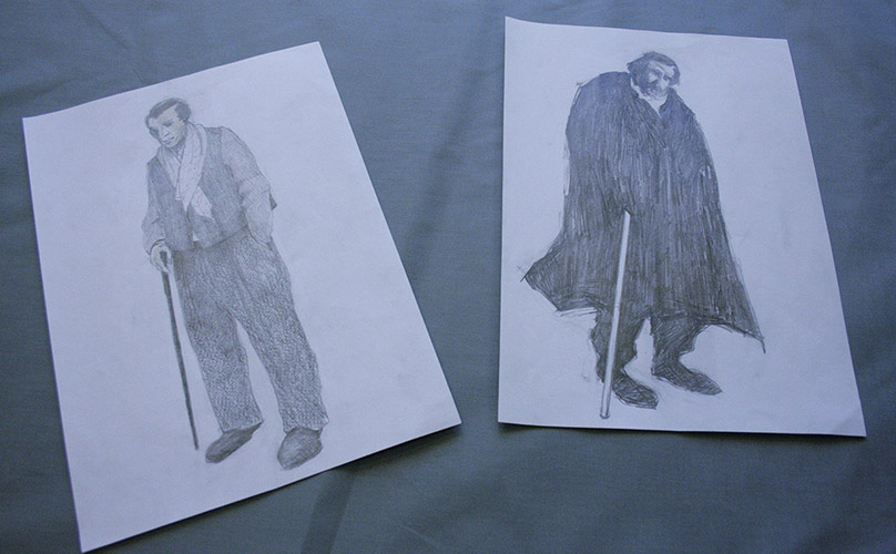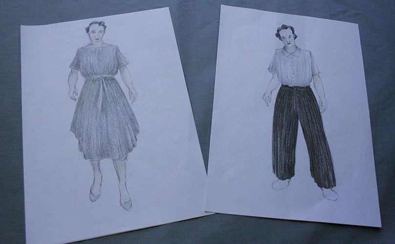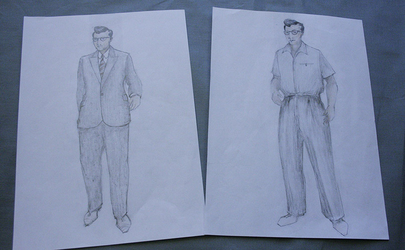 Vi träffade Peder Freiij som gör kostym och scenografi för Europas kniv. Vi fick lov att ta en titt på hans kostymskisser.