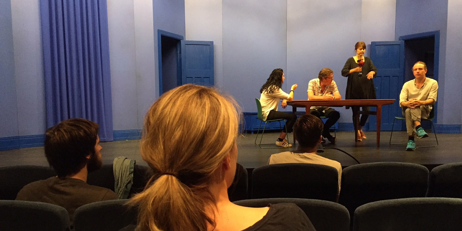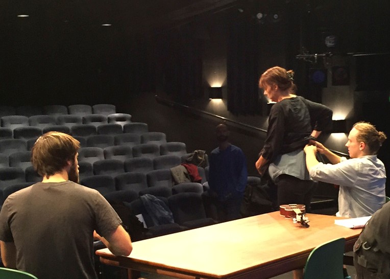 Melina Tranulis, Dag Malmberg, Victoria Olmarker och Hampus Hallberg repeterar inför Sverigepremiären av Skymningsrök, 23 sept på Studion.