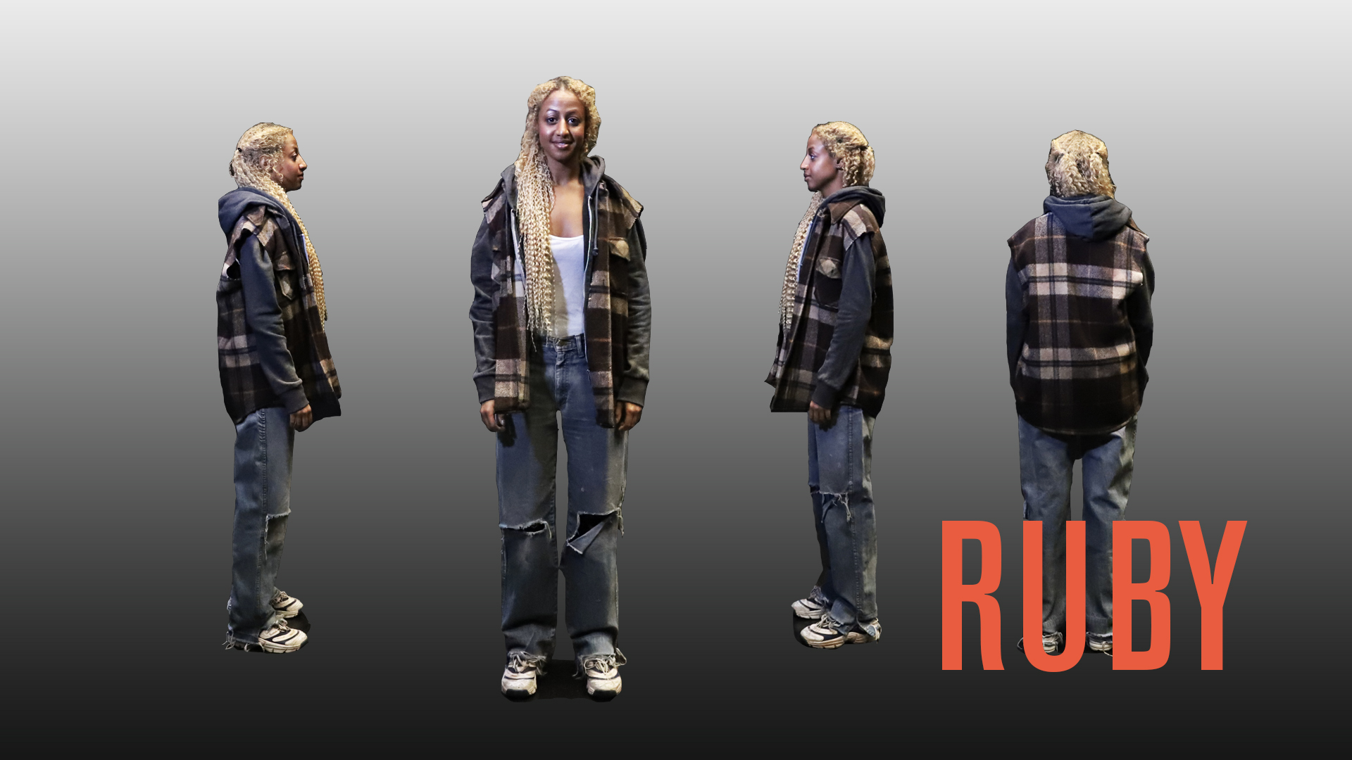 Jag heter Ruby och är 18 år. När jag var liten smet jag iväg när jag var med mina föräldrar på ett köpcenter. Några spanare i flocken hittade mig och tog med mig ut i skogen, till deras kollektiv. Eftersom jag aldrig riktigt hade chansen att lära mig ett mänskligt språk så är mitt tal lite begränsat, men jag är bra på att kommunicera med kroppen. Till exempel har jag en spirituell kontakt med Motherdog, hunden som var flockens ledare innan hon dog. Genom en spirituell ritual kan jag kanalisera henne, då kan hon prata med flocken genom mig.