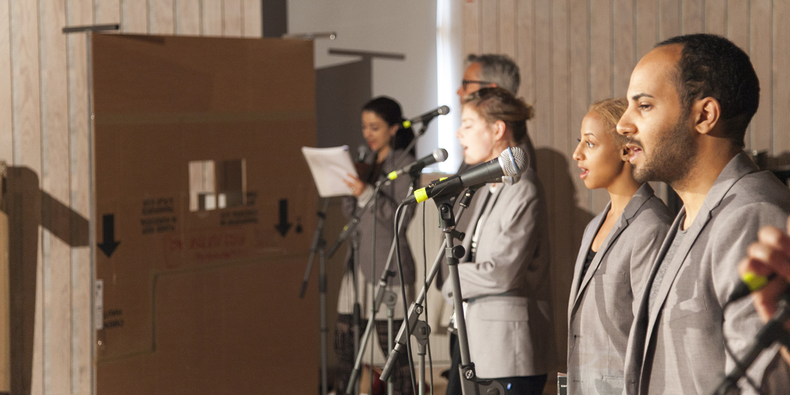 Här ovan ses hela ensemblen i Utvandrarna. Alla för berättelsen framåt och alla förutom Gizem Erdogan och Ashkan Ghods gör flera roller i Pontus teaterversion av Vilhelm Mobergs roman Utvandrarna. Från vänster Gizem Erdogan (Kristina), Johan Gry, Alexandra Nordberg, Hannah Alem Davidson, Magdi Saleh, Ashkan Godhs (Karl-Oskar), Kristina Issa (leder sången).