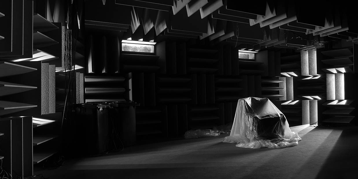Resultatet: en kammare med helt tyst, och kompakt akustik. De geometriska formerna skapar en klaustrofobisk, nästan aggressiv känsla. Utspelar det sig i en faktisk miljö eller i en fantasi? Det skulle lika gärna kunna vara inuti en hjärna, enligt Alex Tarragüel Rubio.