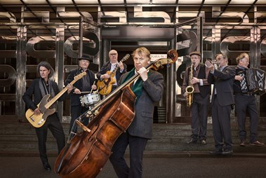 I förgrunden Tomas von Brömssen. I bakgrunden Michael Krönlein, Per Melin, Anders Blad, Stefan Sandberg, Daniel Ekborg, Bernt Andersson Foto: Aorta